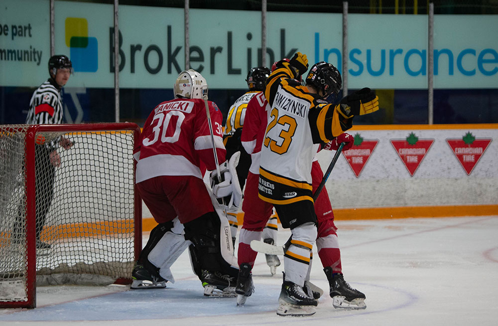Countering on the next shift, Jonah McIndoo put Blind River on the board as he finished off a third chance for his side in close in eluding a sprawled Eagles goaltender, Jace Knoerle.