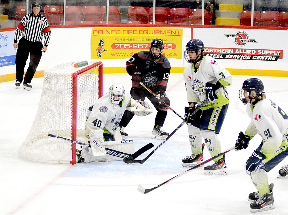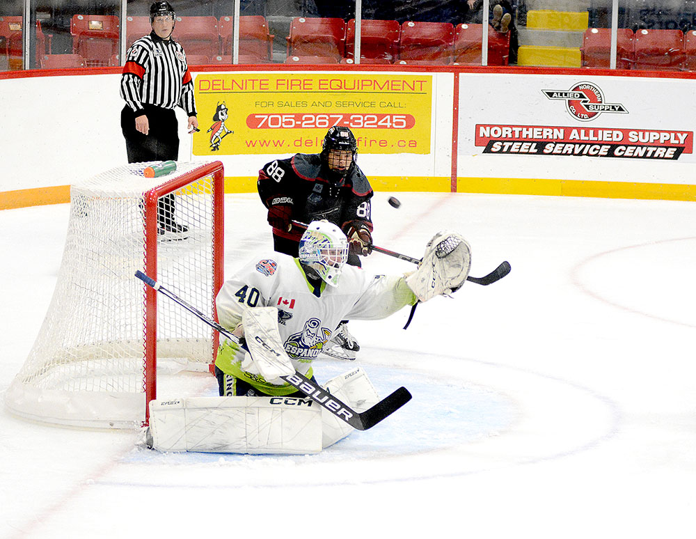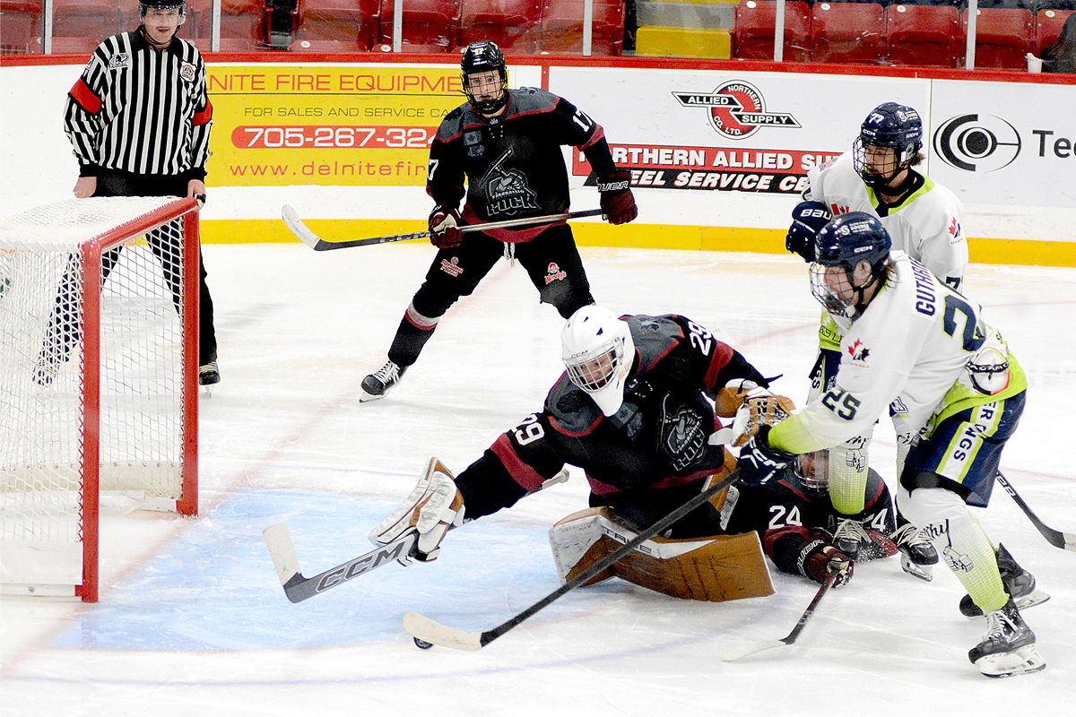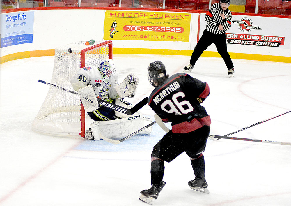Heading to the third period, the guests added to their edge at 4:53 when Graydon Guthrie swiped the puck off a Timmins defender and went to the net where he made a crafty move in close, then cut to his left and slid in his fourth of the campaign.