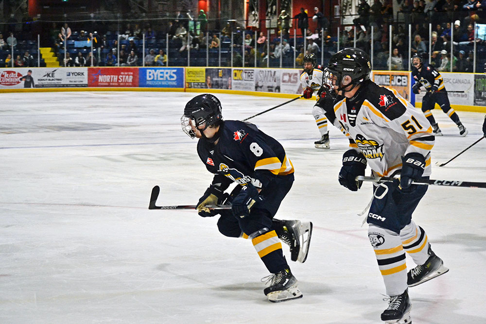Countering while shorthanded midway through the first period, Landon Trethewey drew the Storm level as he corralled a feed from down low by Lucas Peever and stuffed it past Gold Miners’ goalkeeper Glen McInnes.
