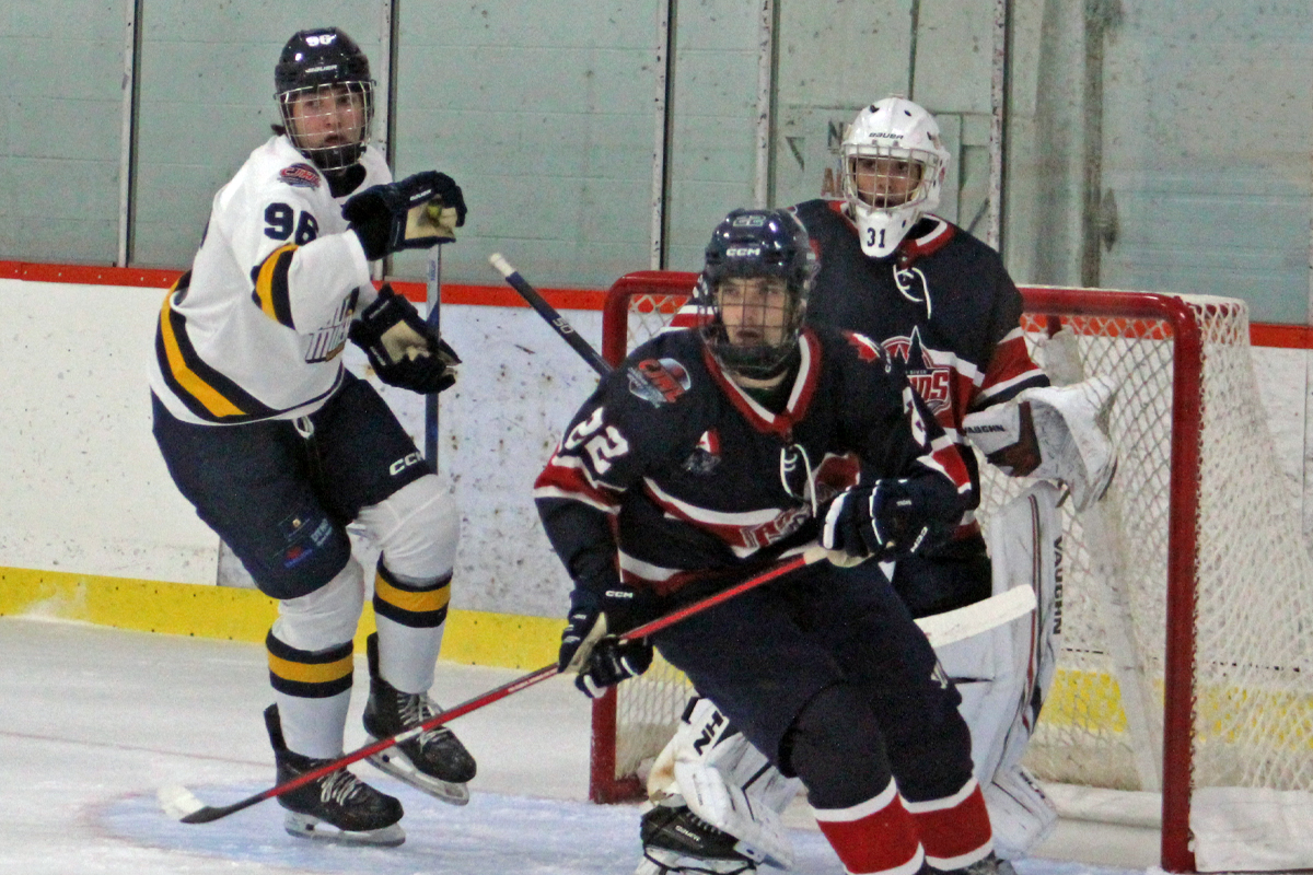 Responding on a five-on-three early in the third, Tristan Kitchen snapped a shot upstairs from close range then scored again just over a minute later by pumping in a rebound at the top of the crease for his first two league markers.
