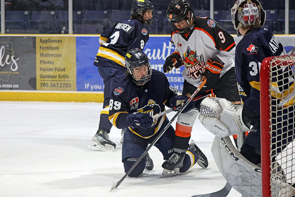Hearst came back to tie it three and a half minutes later as Mavrik Chan-Miguel led a rush up-ice, then cut around a Kirkland Lake defenceman and went to the net where he lifted his chance by goalkeeper Glen McInnes as he scored for a third straight outing.