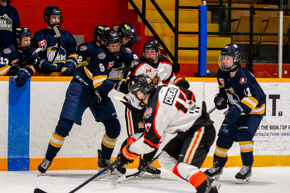 Pushing hard for an equalizer with McInnes out for an extra attacker, the Gold Miners’ Isaiah Allen tied it as he kept a play alive in the Hearst zone where he cut into the right circle and snapped in the tying goal with 63 seconds left in regulation to force overtime.