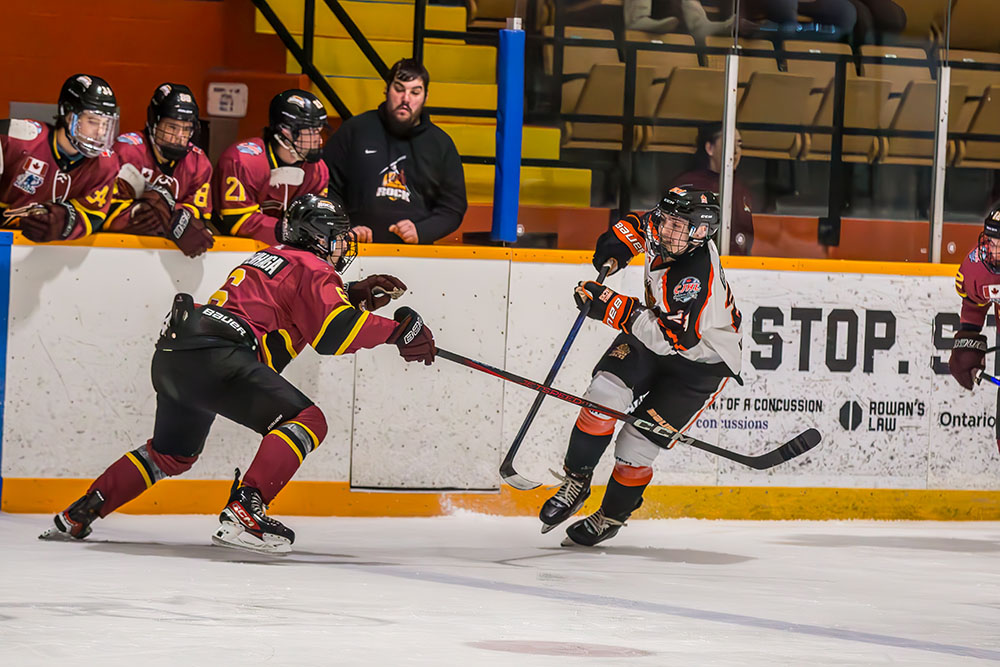 Hearst countered that while up a skater as Chan-Miguel converted at 4:20 off a head-man feed generated by goaltender Jack Helkie and guided in a rebound off a Cameron Menard shot.