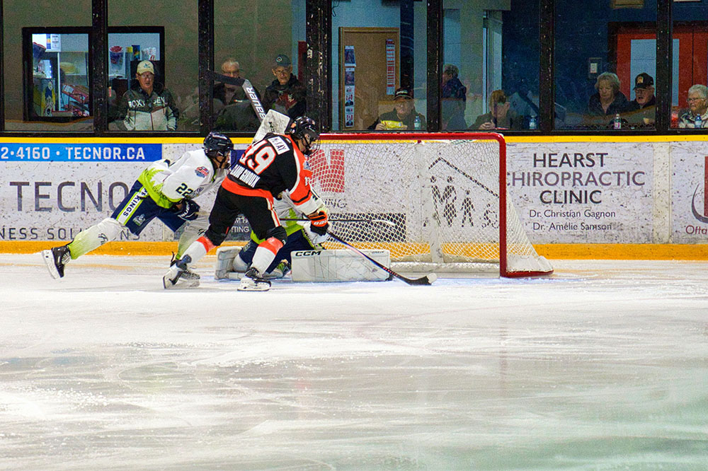 Needing just three minutes to strike as many times and chase Espanola starter Jack Helkie, in favour of backup Logan Vale, Hearst were quick to build up an early 3-0 lead.