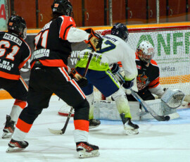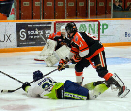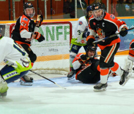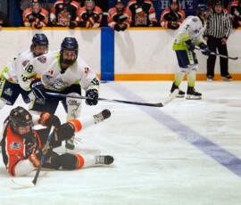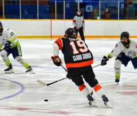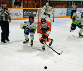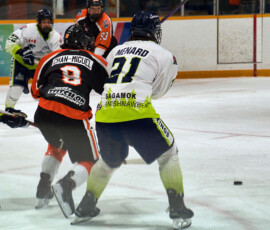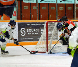 Mavrik Chan-Miguel then made it 2-0 at 2:05 by kicking the puck up with his skate at the top of the crease then whipping it in before Julien Trudel dispatched Helkie by cranking a blast from distance at the right point.