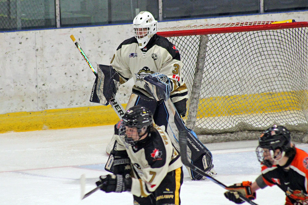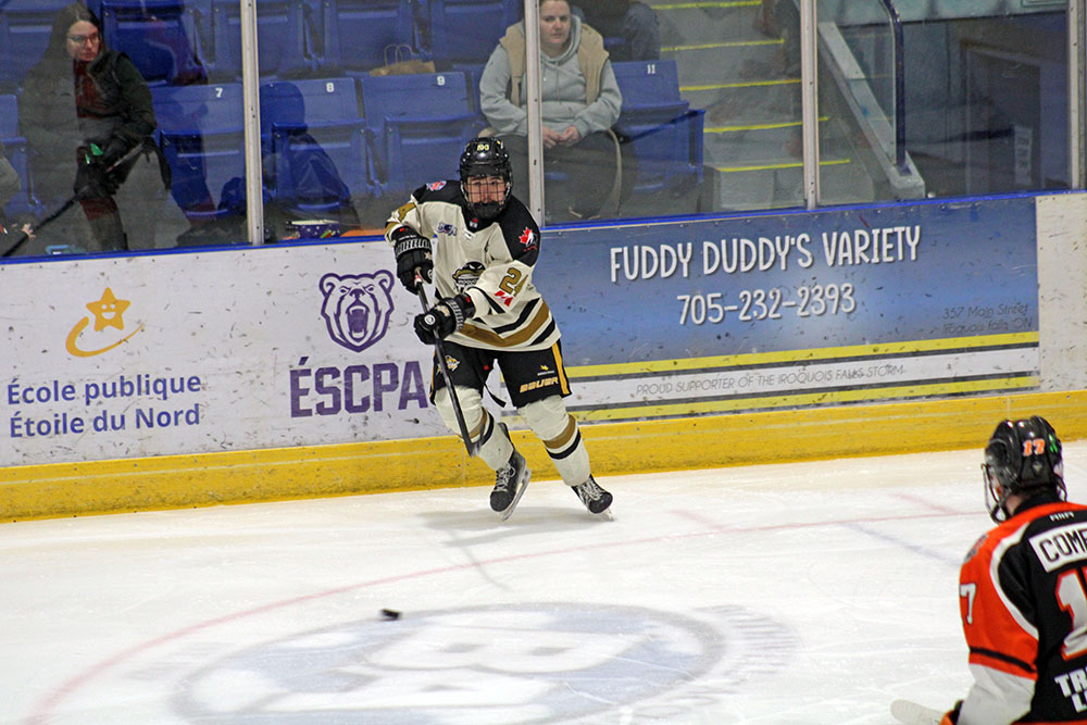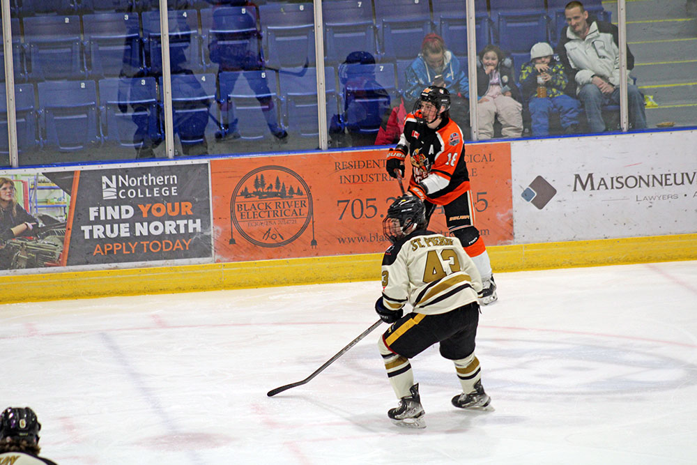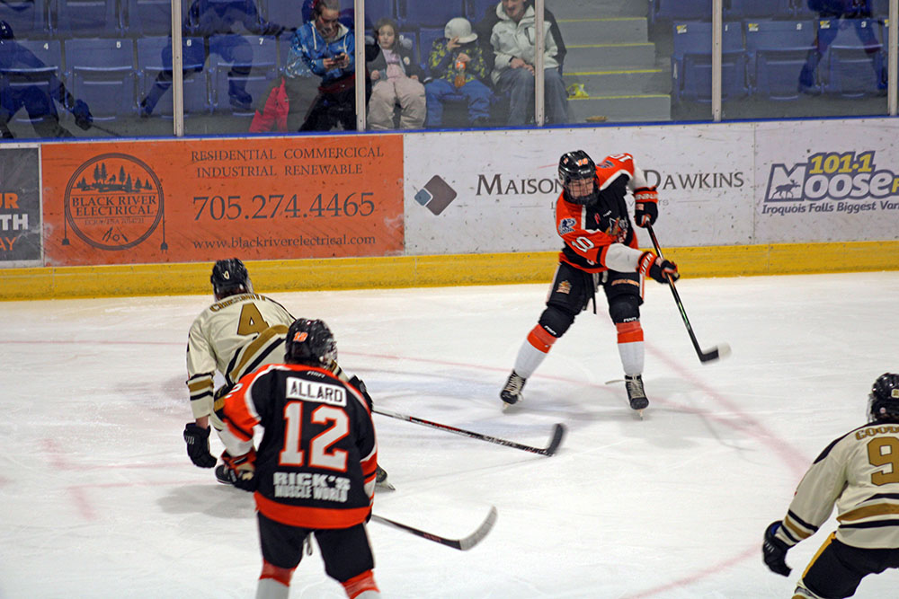 Action in the third featured the visitors adding some insurance with six minutes to go as Hugo Allard rushed in with pace into the Iroquois Falls end and pressured a turnover that he used to feed Nathan Feed driving down the slot and saw him bury his chance with a sharp wrist shot past Cardiff-Bilodeau.