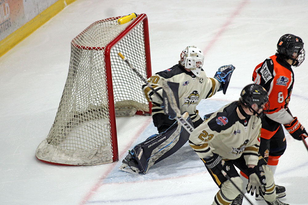 IROQUOIS FALLS, Ont. – Collecting his first Northern Ontario Junior Hockey League shutout, Hearst Lumberjacks goaltender William Stonehouse was unbeatable, while their captain Mathieu Comeau reached a significant milestone late, as part of a 3-0 win over the Iroquois Falls Storm Friday at Jus Jordan Arena.
