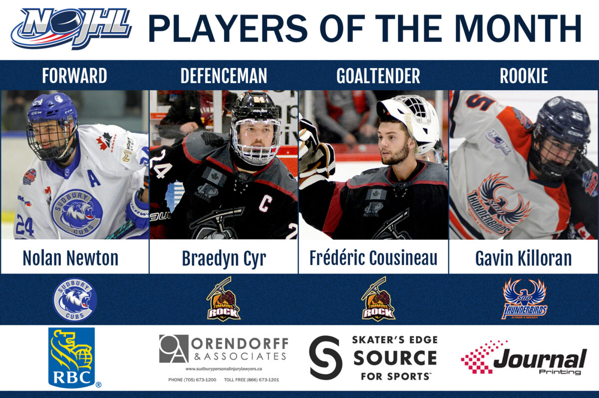 SUDBURY, Ont. – The Northern Ontario Junior Hockey League (NOJHL) announced Monday that Nolan Newton (Greater Sudbury Cubs); Braedyn Cyr (Timmins Rock); Frédéric Cousineau, (Timmins Rock) and Gavin Killoran (Soo Thunderbirds) have named its RBC Forward; Orendorff & Associates Defenceman; Skater’s Edge Source for Sports Goaltender and Journal Printing Rookie of the Month, respectively, for November.