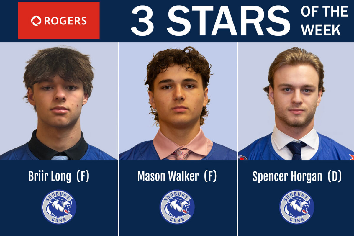 SUDBURY, Ont. – The Northern Ontario Junior Hockey League (NOJHL) announced Monday that the Greater Sudbury Cubs trio, featuring forwards Briir Long and Mason Walker, along with defenceman Spencer Horgan, have been named the Rogers 3 Stars of the Week, for the period ending April 19.