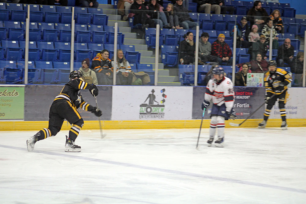 Going to work on the night’s first man advantage, French River took the lead 4:41 in as Joey Stiles ripped a shot through traffic into the left corner that eluded Iroquois Falls starter Virgil Sausset-Plateaux.