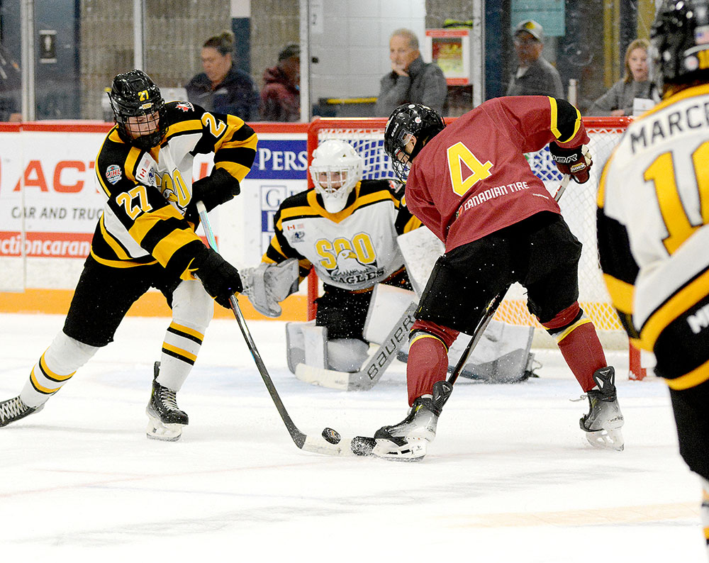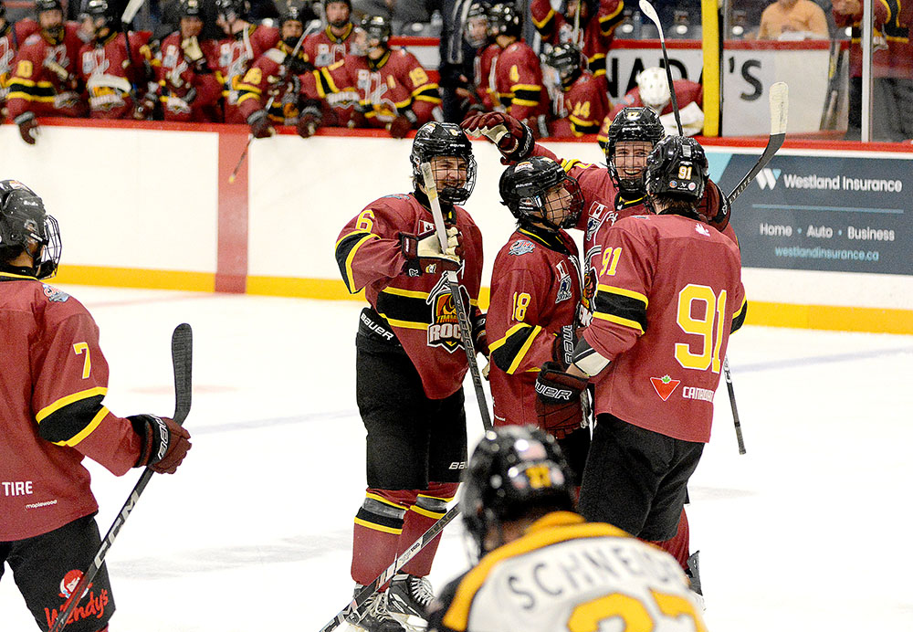 Getting one back before the first intermission, the Soo darted out in transition and saw Ethan Hoff snag the rebound on the ride side off a Carter Huckson attempt and fire it in past Rock netminder Frédéric Cousineau at 15:18.