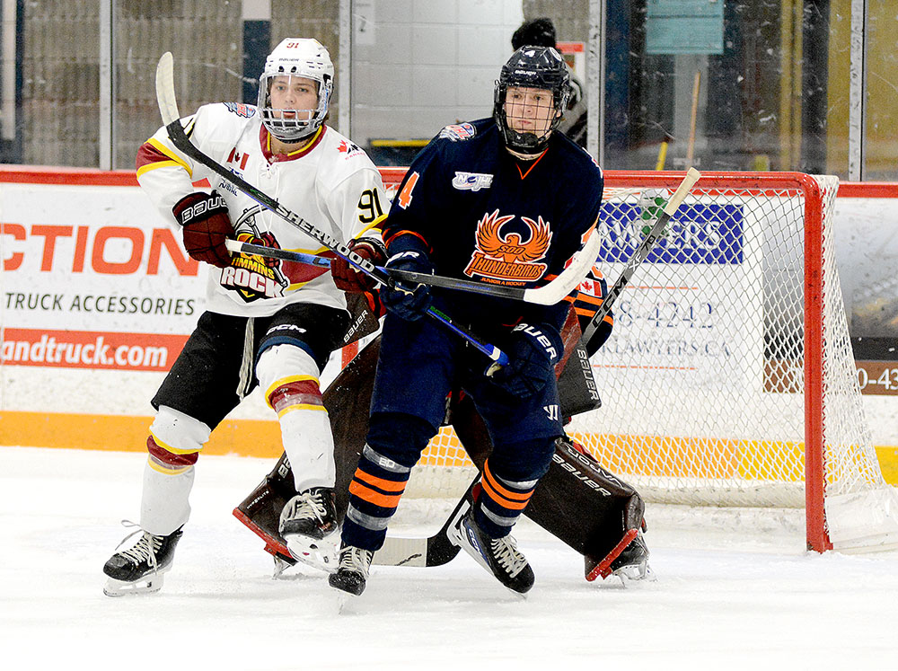TIMMINS, Ont. – A Braedyn Cyr marker 44 seconds into overtime helped the Timmins Rock withstand a late comeback by the Soo Thunderbirds and prevail 6-5 Friday in Northern Ontario Junior Hockey League action at McIntyre Arena.