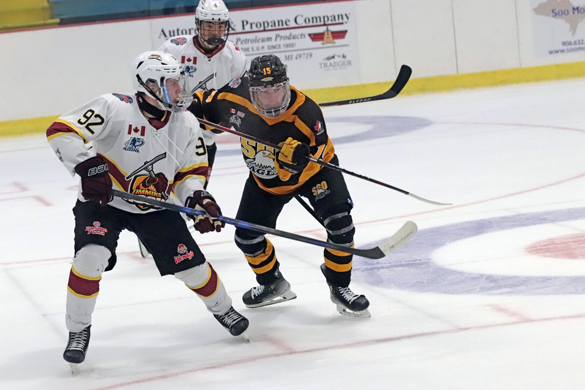 SAULT STE. MARIE, Mich. – A three-goal night off the stick of Diego Da Silva, which included the game-winner, helped send the Timmins Rock to a narrow 4-3 triumph versus the Soo Eagles Saturday in Northern Ontario Junior Hockey League action at Pullar Stadium.