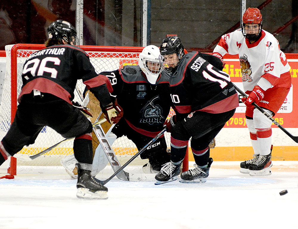 Blind River eventually dashed the shutout bid of the Rock’s Frédéric Cousineau, who was making his league debut, as Ryder Hill collected a turnover behind the Timmins net and sent in front that Jonah McIndoo collected it and tucked in and backhand while moving to his right.